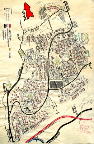 Mapa je částečně dle skutečnosti, částečně dle plánu - realisována nebyla 6. a 7. stavba a silnice na Nivy (+ pár dalších drobností). Asi rok 1985.