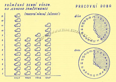 Nějak tam soudruhům chybí, že se začalo pracovat na směny (za Bati a války ne) a šest dní v týdnu. Navíc do Baťovského fondu prac. doby zahrnuli dvouhodinovou polední pausu.
