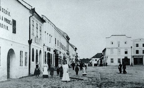 Pohled od dnešní pošty do ulice Rašínovy. Ve druhém domě vlevo začali roku 1894 výrobu papučí sourozenci Baťovi (v době fotografování již byla výroba přestěhována do prvních budov u nádraží).